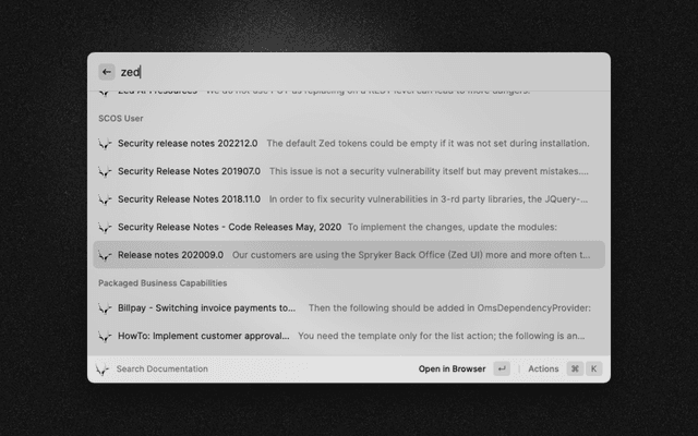 This extension will allow to easily go through the Spryker docs directly from Raycast. It will also allow searching within the documentation with algolia.