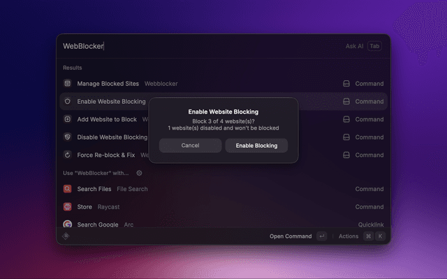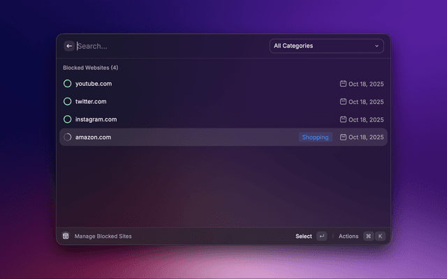 Open Raycast β†’ Type "Manage Blocked Sites"