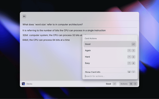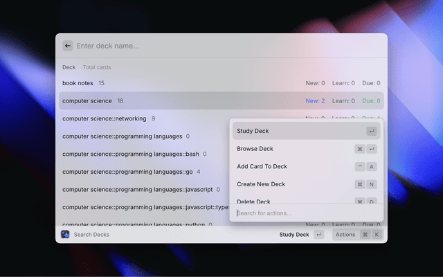 The Anki Extension for Raycast integrates the popular Anki flashcard application with the Raycast interface, providing a keyboard-friendly way to manage and review your Anki decks. It attempts to provide an interface and functionality as close to Anki as possible with the help of the exntensible anki-connect and the rich functionality of Raycast.
