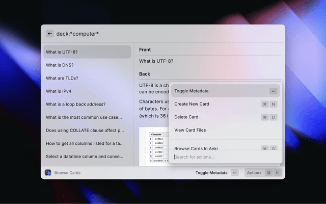 Browse CardsBrowse all cards in AnkiSearch, View, View Metadata, Delete, View Files