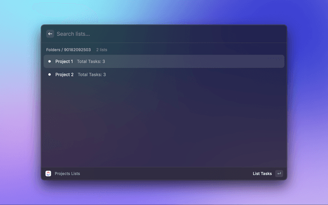 Make sure Raycast is installed and go to https://www.raycast.com/aparandeh/manage-clickup-tasks.