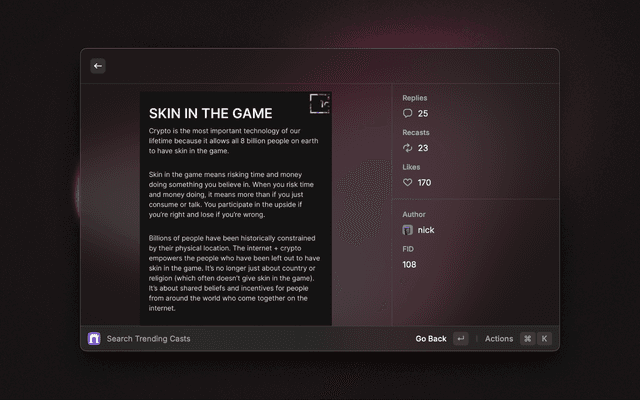Most comprehensive extension for Farcaster. Search for casts, profiles and more. In order to use this extension, you'll need a Neynar API Key