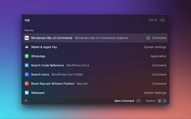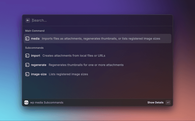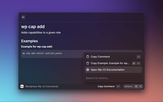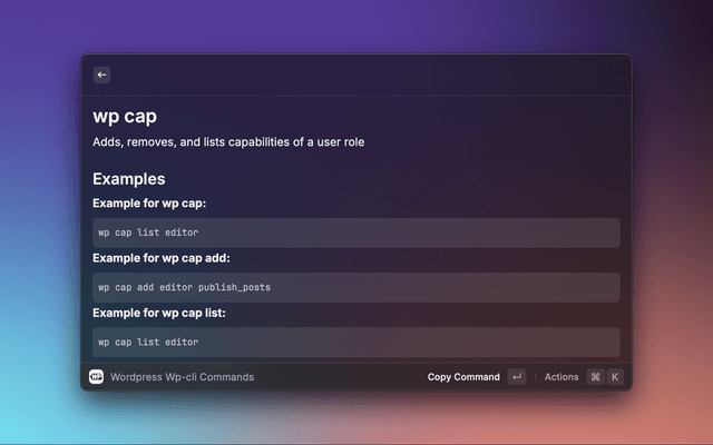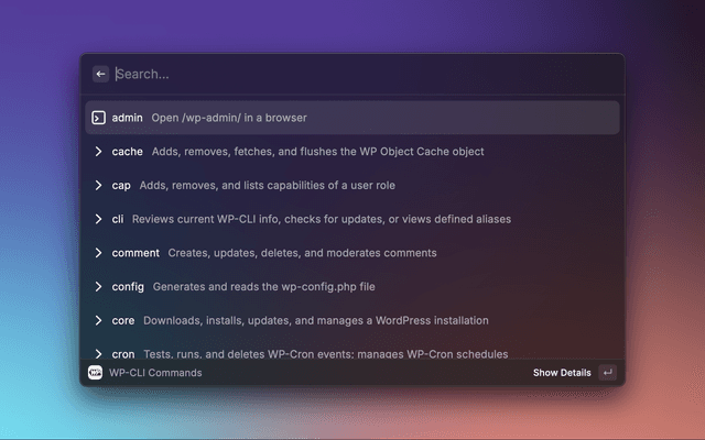 A Raycast extension that provides a searchable interface for WordPress WP-CLI commands, their descriptions, and subcommands.