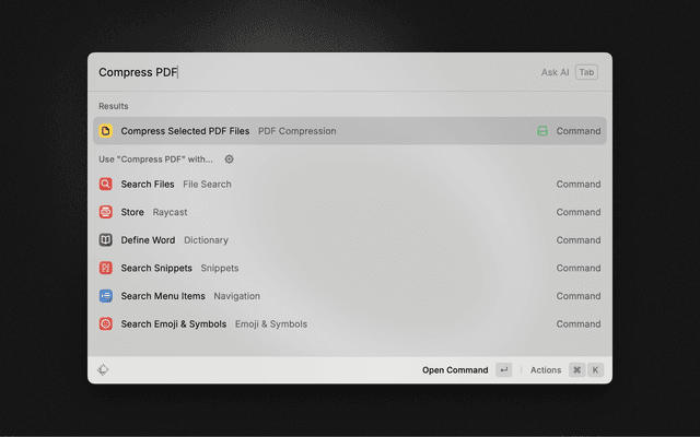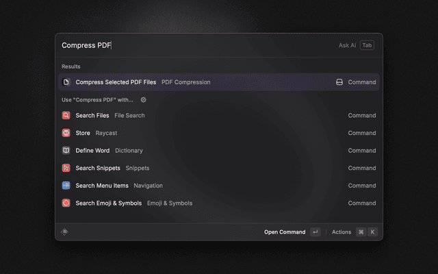 Efficient PDF Compression using native macOS API PDFKit. The usage of the extension does not require any additional software installation nor the usage of any third party services.