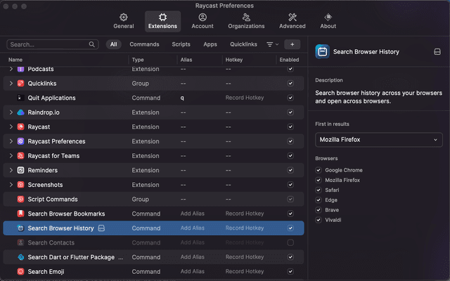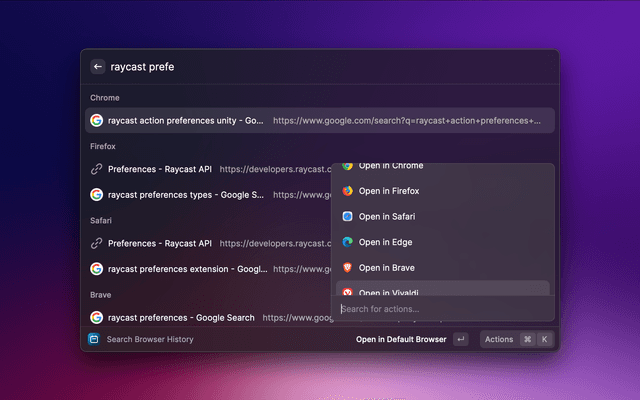 Search and open Google Chrome, Mozilla Firefox, Safari, Microsoft Edge, Brave, Vivaldi, Arc, Opera, Iridium, Orion and Sidekick tabs from search query based on browser history from all browsers.