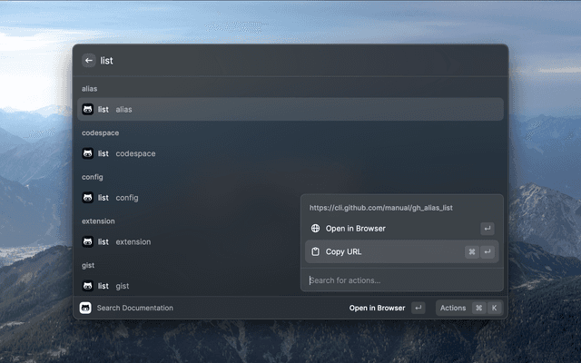 Raycast extension to search GitHub CLI Manual.
