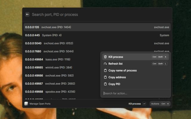 4. Kill Process: Select a port and use the keyboard shortcut or "Kill Process" action