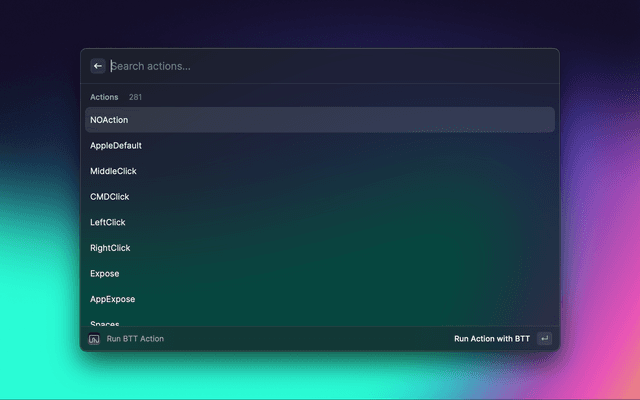 Run BTT actions from Raycast. Be sure to activate external scripting in the BetterTouchTool preferences and optionally configure a shared secret to block unauthorized applications from scripting BTT.