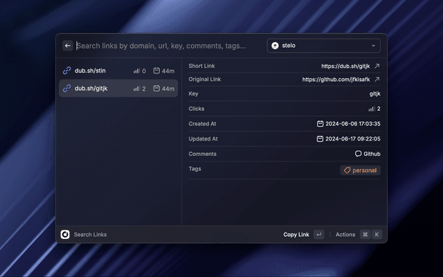 Dub is the open-source link management platform for modern marketing teams. This extension allows you to shorten and retrieve your Dub links directly inside Raycast.