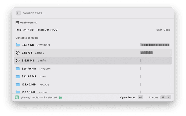 Analyze disk space usage and identify large files and folders in your home directory. This extension helps you quickly find what's taking up space on your Mac.