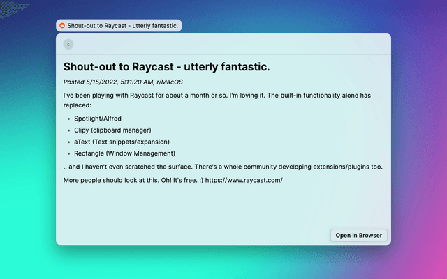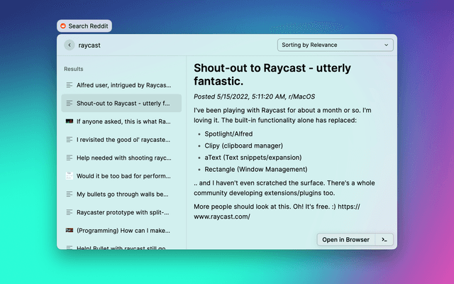 Search Reddit, Subreddits, or within Subreddits and list the results in Raycast.