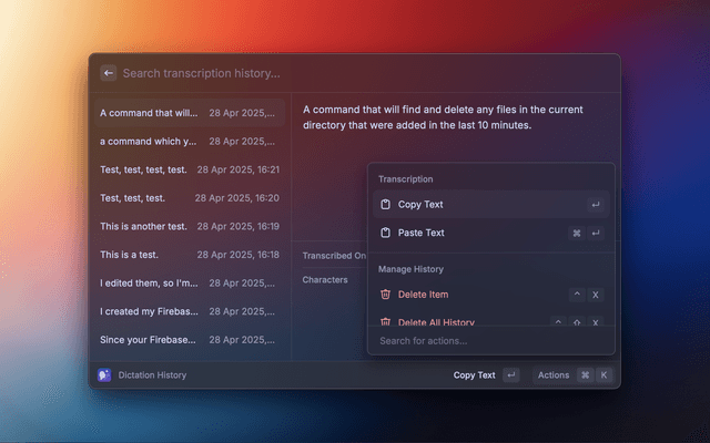 • Refine with AI Optionally refine the transcribed text using Raycast AI or any OpenAI (v1) compatible API, such as Anthropic, OpenAI, a local Ollama server. Download Models Download a variety of whisper models from right within the extension. Dictation History Saves all transcriptions locally with timestamps which can be browsed, copied and pasted using the Dictation History command.