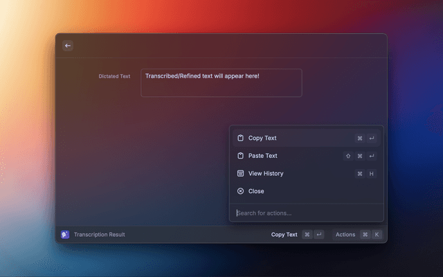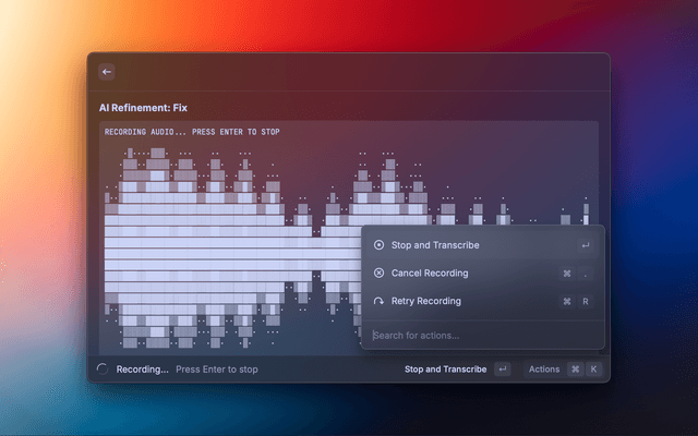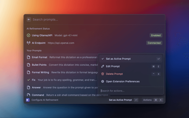 Effortlessly convert your speech to text directly within Raycast using the power of whisper.cpp. This extension provides a simple interface to record audio, transcribe and refine it locally, privately on your machine. Refine the text with custom prompts privately using ollama, or additionally with Raycast AI or any v1 (OpenAI) compatible API.