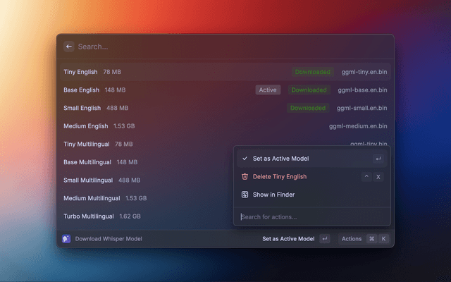 • Choose the Download Whisper Model command and choose the model you would like to download with Enter.