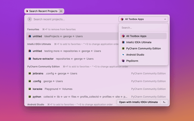 This extension should work out of the box. If you have multiple JetBrains apps installed, you can choose a priority app to bump to the top of the list in preferences.