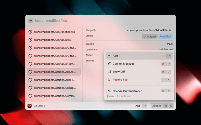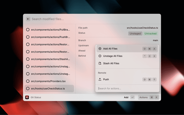 Quickly run git commands through Raycast, allows you to do common git tasks like:
