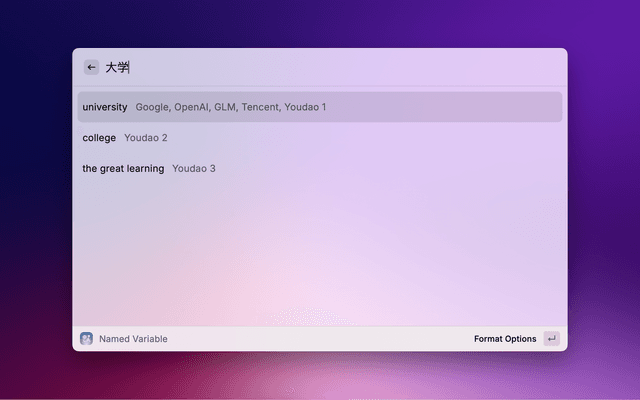 • Automatic merging of identical translation results, prioritizing recommendations from multiple sources