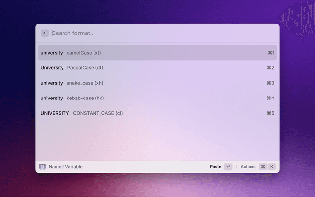 EasyVariable is a Raycast extension that helps developers quickly generate standardized English variable names. It supports converting text from any language (such as Chinese, Japanese, etc.) into programming-compliant English variable names.