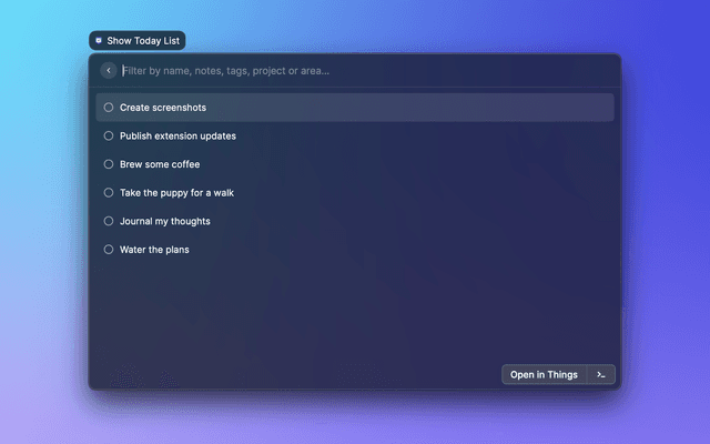 Things → Settings → General → Enable Things URLs → Manage.If you don't see any of your to-dos in any commands, please make sure Things is installed and running before using this extension. If Things is running, you may need to grant Raycast access to Things in System Settings > Privacy & Security > Automation > Raycast > Things.