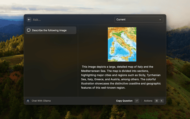 • The commands “Describe Content of Image”, “Get Text from Image”, “Custom Command”, and “Chat with Ollama” support loading images only via image path.