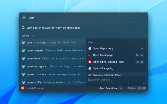 • choose the default "open" action for a package: "open repository", "open homepage" or "open npm package page" or "open Skypack package page"