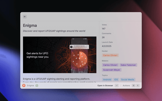Browse and discover the latest products on Product Hunt directly from Raycast.