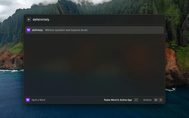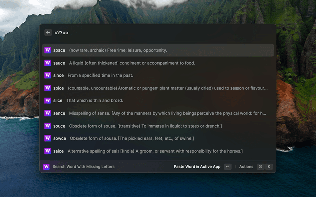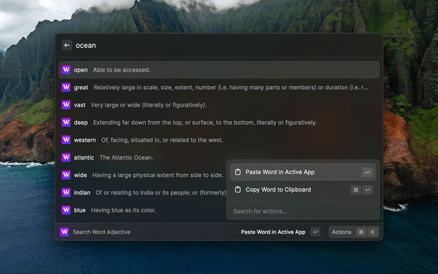 Search for synonyms, antonyms, spellings, adjectives, rhymes, and words with missing letters using Raycast!