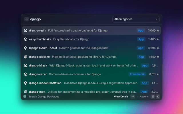 • πŸ” Fast package search – Debounced queries against the Django Packages API return relevant packages quickly.