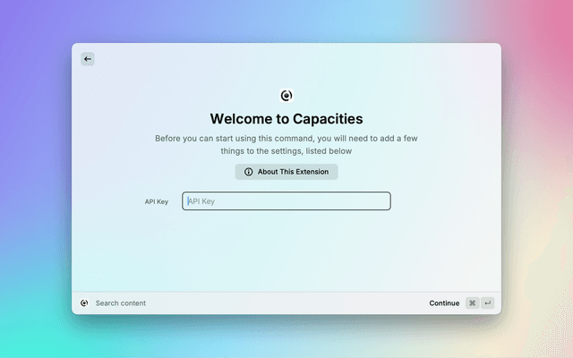 Interact with Capacities from your command bar. Search your notes, capture content & more.