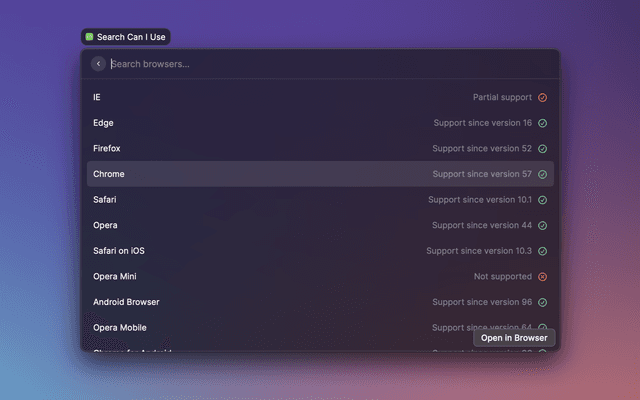 It's possible to configure this extension so that it reads the Browserlist configuration on web projects and show you the technologies supported (or not) directly from the main view. To do so, add the path to your project in the preferences in "Project path" (e.g ~/my-project)