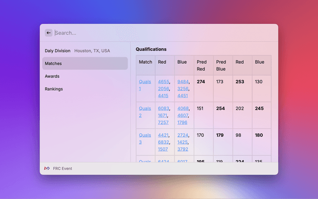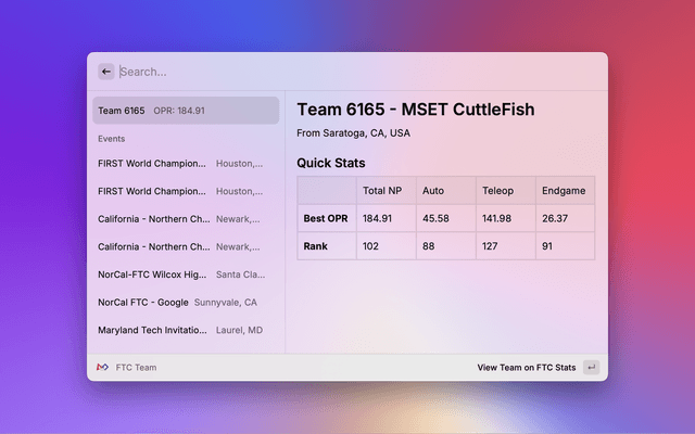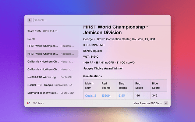• FTC Search: Allows you to search for FTC teams and events, showing you either quick stats about a team or all the matches in an event.