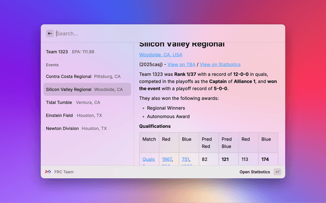 Statistics for FIRST Robotics Competition and FIRST Tech Challenge right at your fingertips.