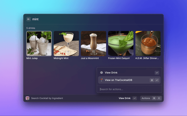 This is a Raycast extension to get a Cocktail by its Name or Ingredient using https://www.thecocktaildb.com/api.php. An API Key is not required but the Free version is limited to 25 items at a time. If you need more features, you can subscribe to their Patreon to get a paid API Key. You can then enter this API Key in Preferences.
