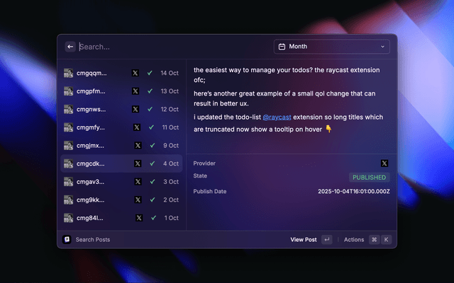 This is a Raycast extension for Postiz - The All-in-One Social Media Management Tool. With this extension you can: